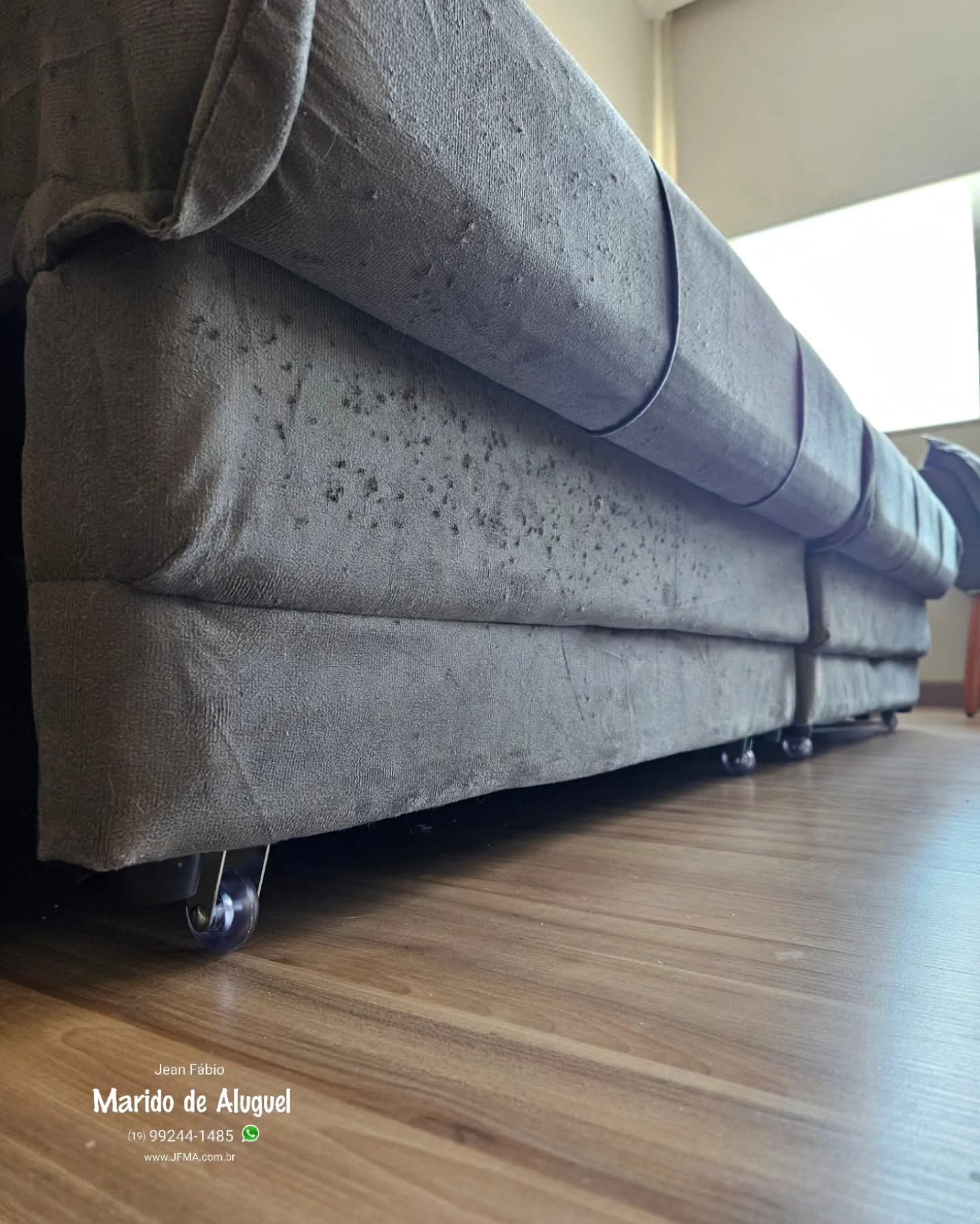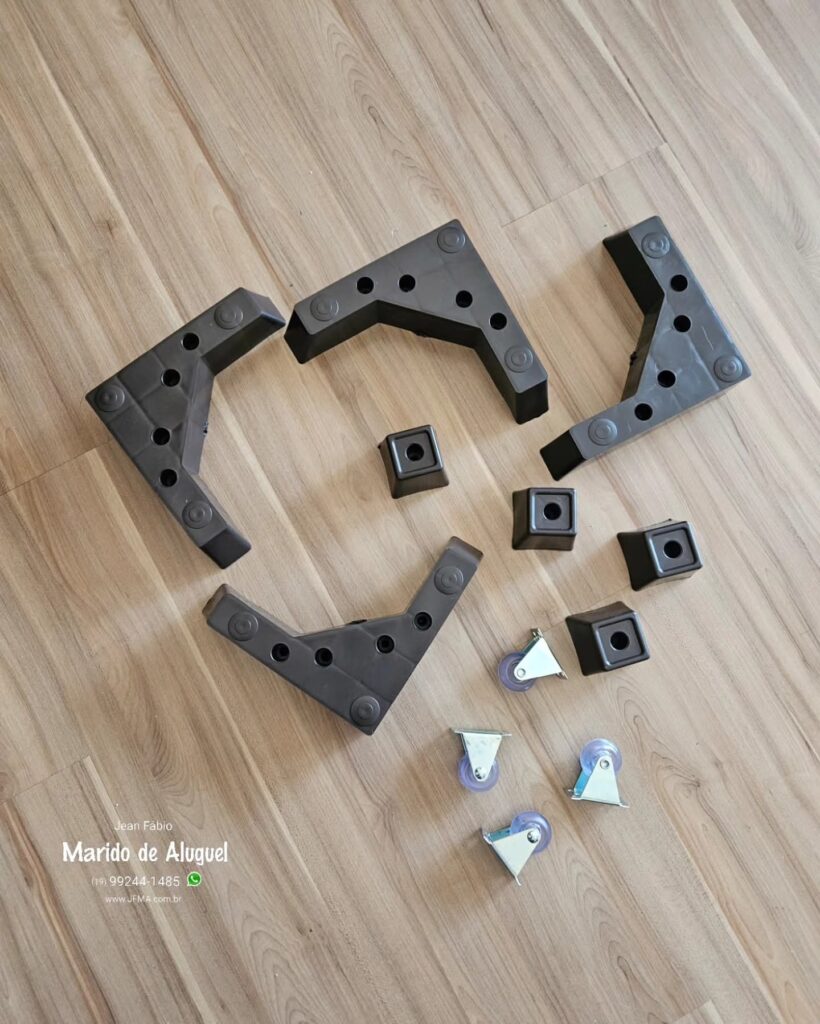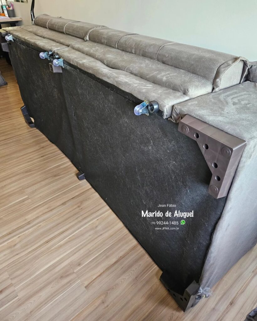 Esse sofá retrátil já tinha os pezinhos, mas por conta da mudança de residência, acabou quebrando os pés. A cliente comprou um kit novo, com pés de plástico e as rodinhas que ajudam a puxar o retrátil. Retirei os pés antigos, fiz a substituição pelos pés novos e também instalei as rodinhas. Depois de tudo no lugar, o sofá voltou a funcionar direitinho, com mais estabilidade e facilidade pra abrir e fechar.