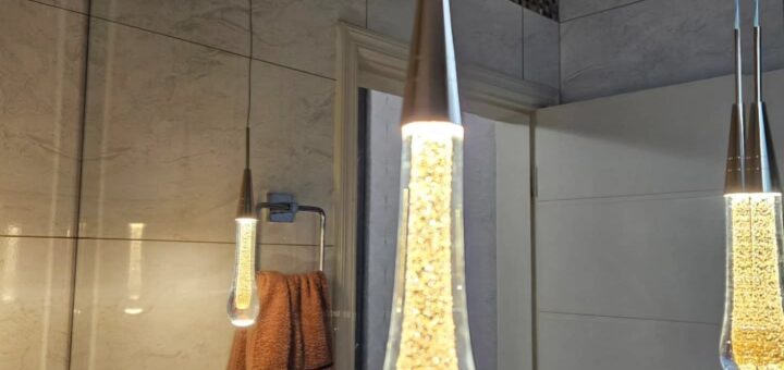 Nessa casa, quando foi feita a sanca de gesso do banheiro, já tinham deixado dois pontos de energia elétrica preparados para iluminar a área da pia e do lavabo. Como a fiação já estava...