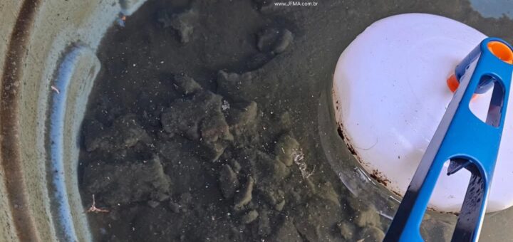 Nessa casa fui chamado pra fazer a limpeza da caixa d’água.Ao subir até ela, fiz todo o processo: esvaziei, escovei e retirei toda a sujeira acumulada no fundo. Tinha bastante sedimento grosseiro, aquelas sujeiras...