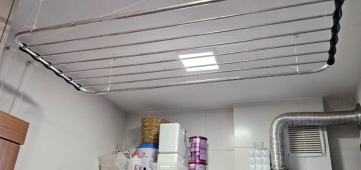Nessa casa, a cliente comprou um varal de teto, modelo convencional, mais simples e funcional pro dia a dia. O diferencial aqui foi o tipo de teto: como é rebaixado em gesso, já orientei...